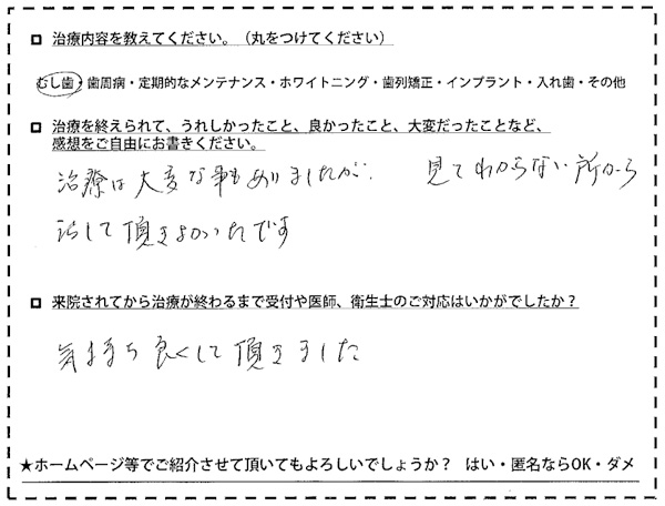 治療は大変な事もありましたが見てわからない所から治して頂きよかったです