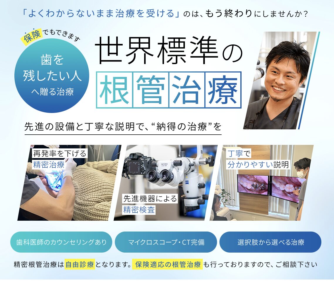 医院の方針や設備によります。当院では保険診療でもマイクロスコープを使用し、拡大視野で確認しながら治療を行っています。